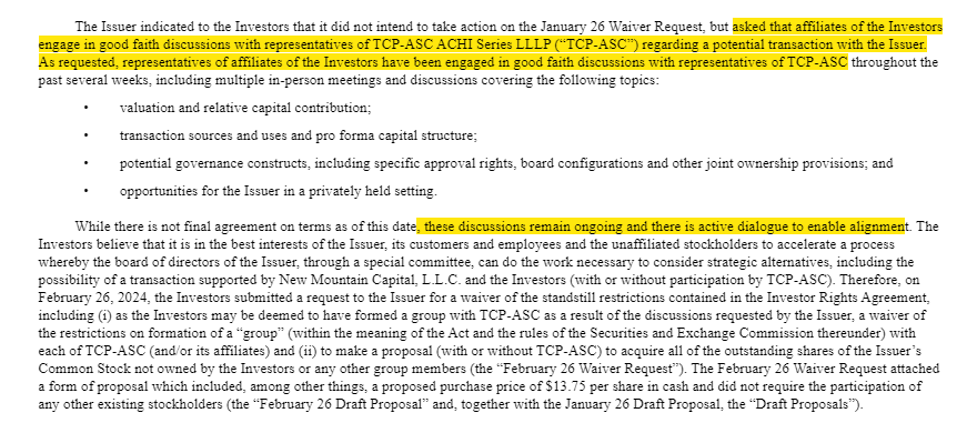 Obviously you can see my highlights there, but look at some of that language. At the time of the filing, I read those and thought “o, the control shareholders are getting ready legally to take RCM private on the cheap and need waivers.” And yes, that’s part of it. But quotes like “possibility of a transaction supported by New Mountain Capital (whether with or without participation by TCP-ASC or its affiliates)” and “at the request and urging of the Board of Directors of R1 RCM Inc.” take on a new light when you think about subsequent developments. Perhaps NM and TCP had been fighting over strategy for months, and the board was urging them to talk in order to figure out a path forward for the company so that the company didn’t bog down in disagreements over strategy / the company could remain nimble?