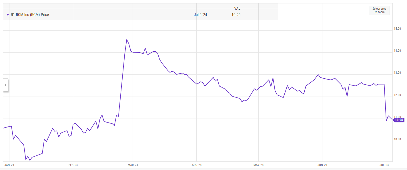 Anyway, the situation is R1 RCM. Long time readers / listeners will remember I did a podcast on them in late January. The podcast was excellent (Jon is very knowledgeable about the company), but the podcast focused on RCM as a value stock and it has become very event-y since then, so the podcast is worth it for background and understanding the company but it has very little to do with the investment case today (aside from informing the event angle and the downside thesis if the event breaks).