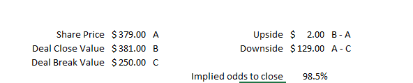 Paying 98-99% is very, very high in a pretty uncertain world…. and I’d argue that number actually understates the odds you’re paying for the deal to close because the downside is likely to be much, much worse.