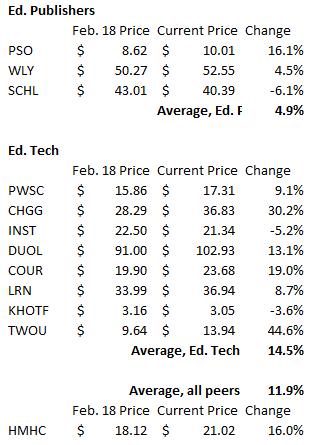 PS- Page 30 of the SC 14D9 lists 11 companies as peers for HMHC. It’s worth noting that since February 18th (the last close before the HMHC deal was announced), 8 of the 11 peer stocks are up, with the average peer stock up almost 12%. Obviously the market can do anything in the short term, but the way peers are trading (combined with the robust projections) suggests to me that HMHC’s “deal break downside” is much, much higher today than it was before the deal was announced (even if you ignore how strong HMHC’s Q4 earnings and outlook are!).