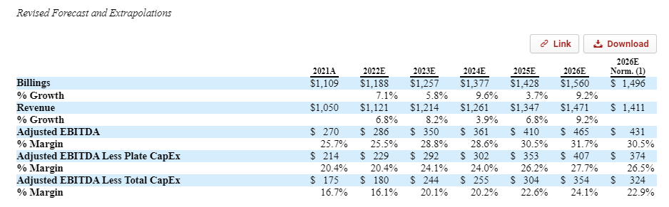 Again, this was detailed more fully in the podcast, but this is the most bonkers business update I’ve ever seen. In August 2021, management was projecting 2021 EBITDA would be $196m, and 2023 EBITDA would come in at $308. Roughly four months later 2021 actual EBITDA has come in at $270m (~37% over initial projections!), and 2023E EBITDA has been bumped by more than 10% (from $308m to $350m).