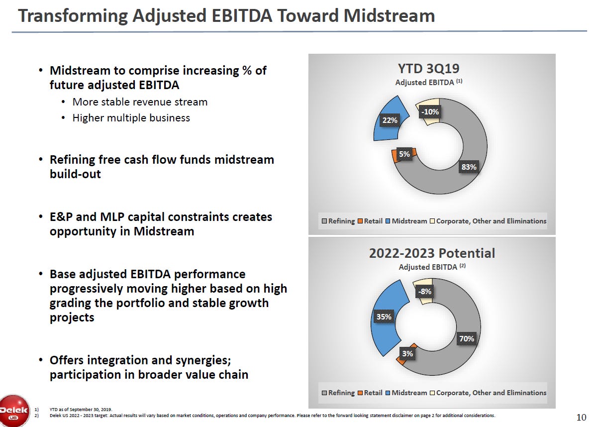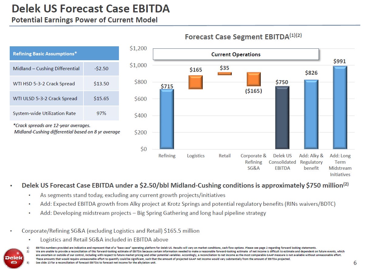 That slide is from DK's Q4'18 earnings deck; interestingly, I haven't seen that normalized earnings breakout in any of their more recent slides. I don't think some of the assumptions match up to current market realities; for example, I believe crack spreads are currently well below what that deck suggests. However, given those spreads and differentials are based on ~a decade of averages, I do think they are interesting for use as a midcycle earnings numbers. (PS I wrote up CVI in the past and used the slide below to guesstimate their midcycle earnings; it suggests a somewhat similar number to what DK's slide would suggest, though obviously it's using slightly different spreads and everything. It also allocates corporate G&A to the refining segment, which as I'll talk about in a second is handled differently in this SOTP).