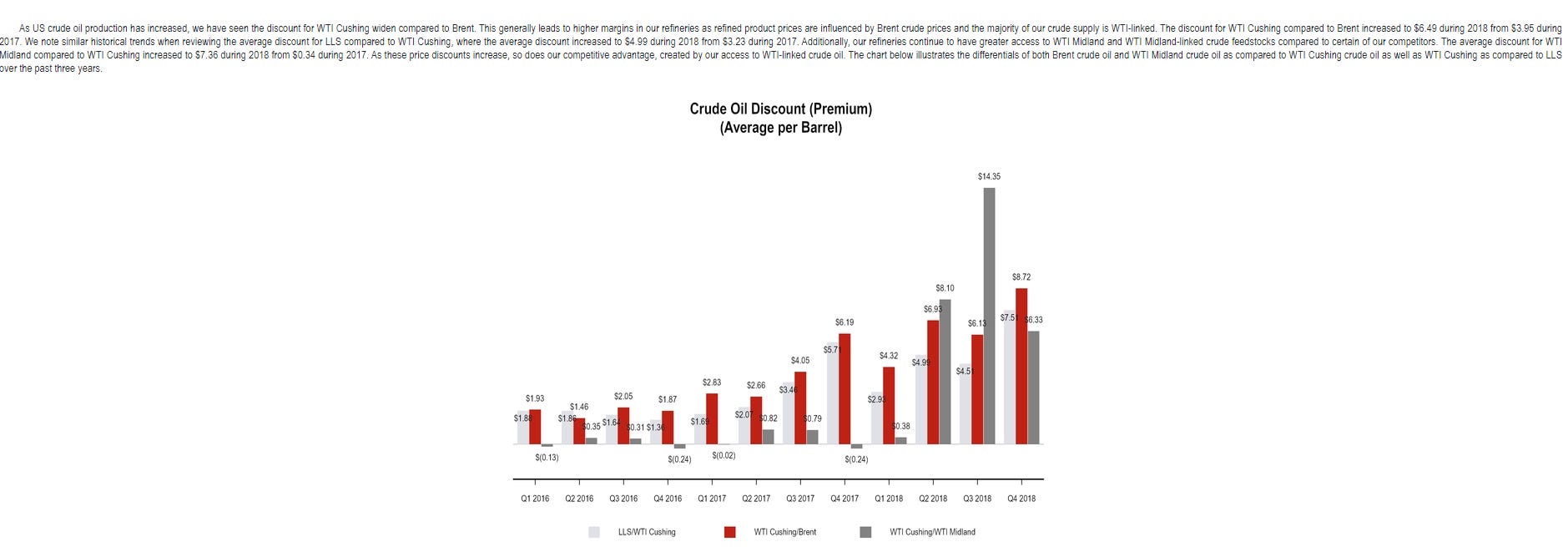 Ok, we've got the DKL pieces of DK valued. Let's turn to the next simplest segment: retail. Retail is a bunch of gas stations in Texas and New Mexico. This segment is rather small; Delek had actually sold all of their gas stations in a prior deal and their current retail segment is the product of the Delek / Alon merger the closed in 2017. There's the possibility for some interesting stuff here, but it's so small the it's not really worth spending time on. Over the LTM, retail has made $60m in segment margin. Peers trade for ~9-10x EBITDA. Let's say that this segment is worth 8x EBITDA; it'd be worth ~$480m. That leaves us with two more segments to value: refining, and corporate / G&A. Of course, those are the doozies. Let's start with refining. Over the LTM, refining has made $835mm in EBITDA (down slightly from 2018's $865m; prior numbers are incomparable given the Alon merger). The big issue with a refiner is that earnings are something of a boom / bust, so you really want to normalize earnings for the environment the refiners are producing in, and there's reason to believe that DK's 2018 / LTM refinery numbers are closer to a "boom" than "bust" earnings number. All of Delek's refineries are located in the Texas / Arkansas / Louisiana region. Basically, they've all been benefiting from super cheap inputs from the Permian drilling boom: Oil and gas companies were doing tons of drilling in the area, so there was tons of crude oil, but there wasn't a lot of infrastructure around to get that crude oil out, so oil in the Permianin area was priced a lot cheaper than elsewhere because it had extra delivery cost. Delek benefited from that differential because their refineries had access to that cheap Permian oil. However, now that more infrastructure has been built out around the Permianian, that price differential should come down and DK's refining arbitrage earnings should drop (the clip below is from their 2018 10-k and shows how big the differentials got for a while).