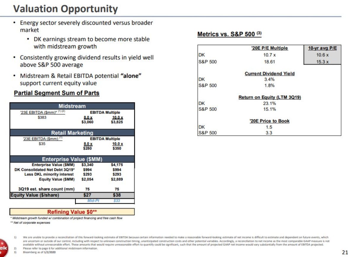 The company has a few growth projects that they've invested in that aren't currently earnings anything but should have pretty significant value. Some of these projects are in DKL, so I assume their value is fairly captured in DKL's price. However, some have had major investments and haven't produced earnings yet and are fully owned by DK, so they could be a source of hidden upside. For example, DK has invested ~$75m into Wink to Webster, and on their Q3'19 call they guided that they could refi that project and get a bit of cash back. That could be an incremental boost to my SOTP.