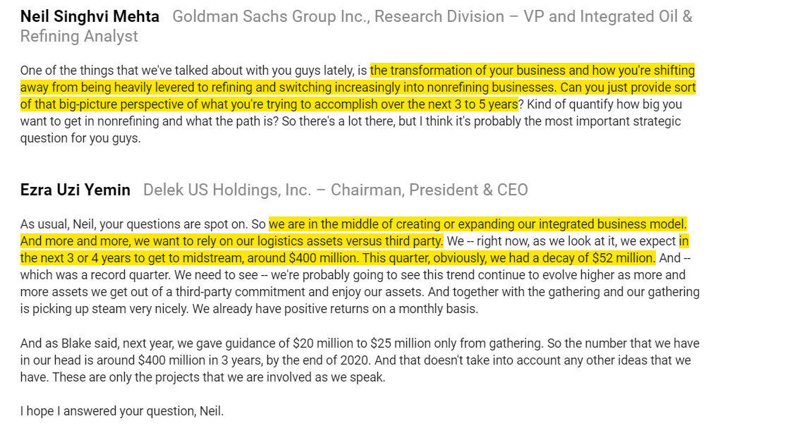 A lot of refining comes down to the outlook for oil pricing and differentials / crack spreads in whatever geography it's exposed to; Delek has a lot of exposure to Permian, and I don't feel like I have a great grasp on the long term drivers there.