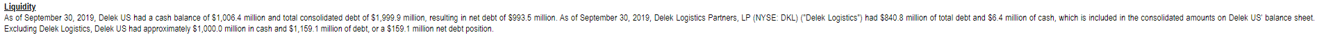 Another thing that really attracts me to DK? It's accounting is complex, which can make it screen funny. Because DK controls DKL, they have to consolidate DKL. That makes their financial statements somewhat unrepresentive of the actual economics of the business. For example, consider the sentence below (from their Q3'19 earnings release). DK has basically no net debt (~$159m of net debt versus >$800m in annual EBITDA); however, their balance sheet shows a billion of net debt because they have to consolidate the non-recourse DKL debt.