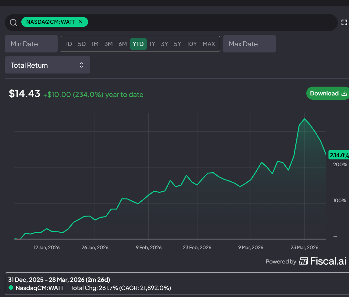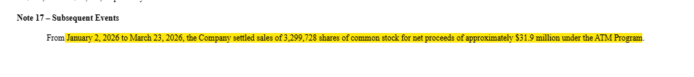 WATT ended 2025 with 2.2m shares outstanding. If you scroll down to their 10-K’s subsequent events, you’ll see the company issued ~3.3m shares through their ATM program YTD through March 23.