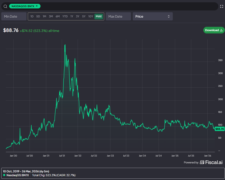 Biontech shareholders are no strangers to volatility. After IPO’ing in late 2019 for ~$15/ADS, BNTX became Pfizer’s partner on the COVID vaccine and saw their stock price peak over $400/share in late 2021. The stock quickly retreated from there; by mid 2022, it was trading for ~$125/ADS, and it’s generally chopped around that price in the years since (it opened the year at ~$105/share).