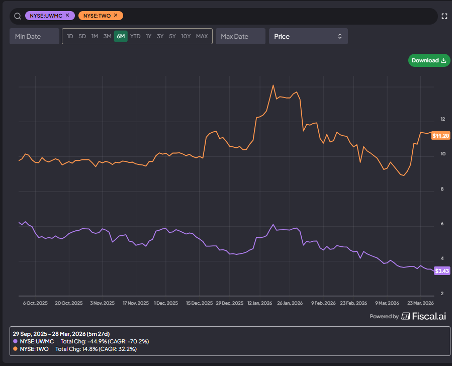 UWMC and TWO announced an all stock merger late last year. TWO shareholders would get 2.3328 shares of UWMC’s stock for each TWO share; at the time of announcement, that valued TWO at $11.94/share. TWO ended 2025 with a book value of $11.13/share, so the deal was priced at a slight premium to TWO’s book value.