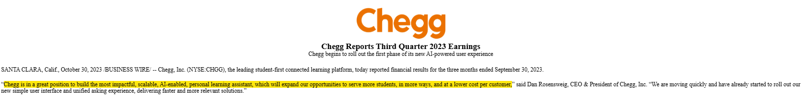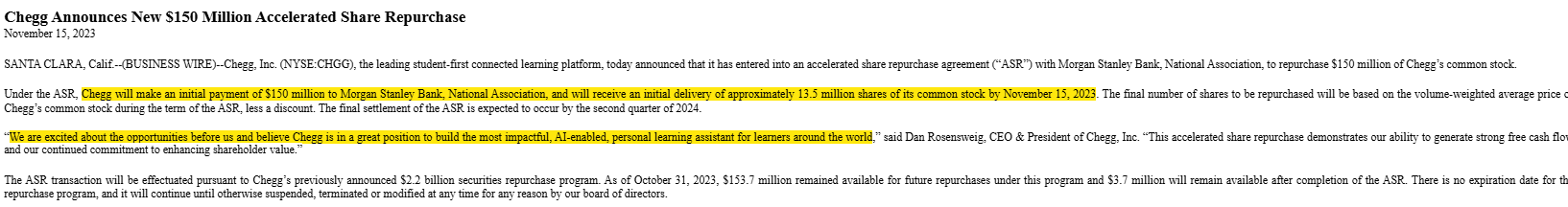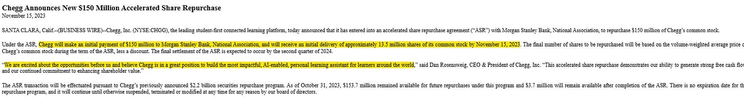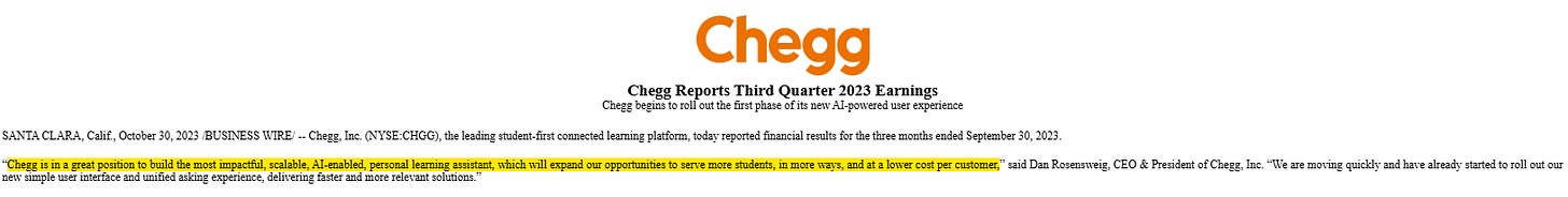Every company is putting on a brave face that they are an AI winner, but it’s not lost on me how fast CHGG got rug pulled and how over confident they were as it was happening (look at this quote from their Q3’23 earnings call, which they quickly followed up with a big accelerated buyback).