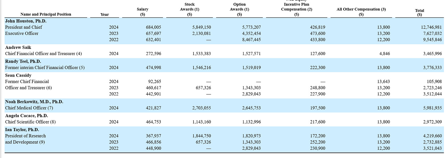 I will admit: I’m not a scientist. I can’t tell you if these drugs are guaranteed blockbusters or absolutely failures (though I doubt anyone could tell you that with certainty). However, I do know corporate governance and compensation reasonably well, and given that knowledge (plus a sprinkling of common sense) I know that a company pursuing three phase 1 assets should have a dramatically different cost structure than a multi-billion dollar market cap company that has line of sight to commercializing a multi-billion dollar blockbuster (as Arvinas was with vepdeg ~two years ago). Arvinas is set up as the later despite clearly being the former. Top management combined make >$25m/year…