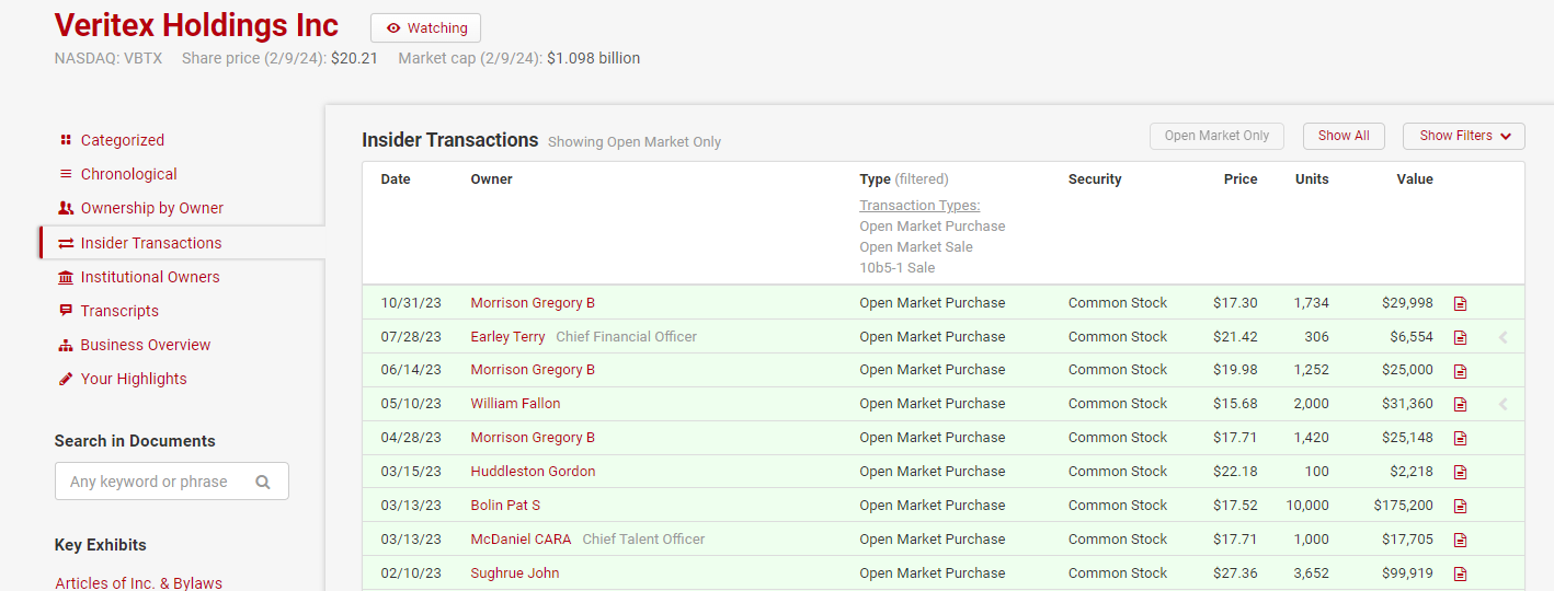 And insiders have basically only ever sold stock, never bought any. That’s particularly interesting as almost every bank had a wave of insider buying in Spring 2023 as bank insiders took advantage of depressed prices on the heels of SIVB and FRC failing / bank insiders tried to build market confidence to avert a bank run (it could be either, depending on who you asked). Here, for example, is VBTX’s insider transactions over the past year; it’s broadly representative of most smaller banks.