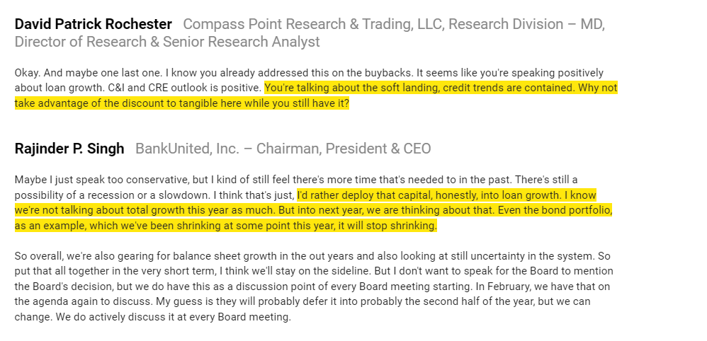This is interesting because BKU was explicitly asked about rent-regulated loans (the loans that got NYCB into trouble) on their earnings call and they noted they have insignificant exposure ($121m of loans on a ~$25B loan book is basically zero).