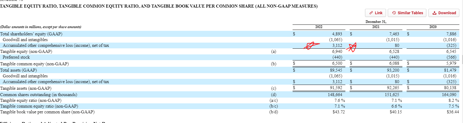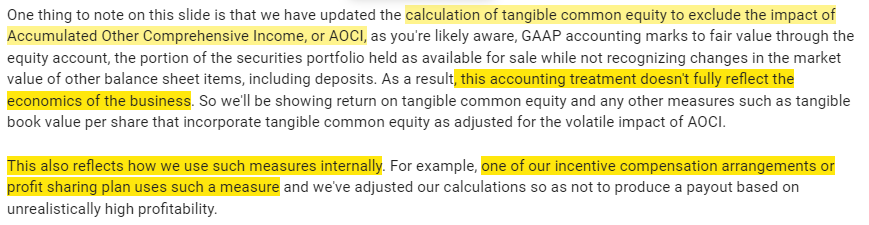 See those stars? In 2022, ZION had a ton of available for sale fixed rate securities move against them, so ZION decided to switch their accounting treatment so that they didn’t have to mark those securities against their tangible book value. That >$3B add back is Zion adding back all of those losses! Absolutely wild… and not only did Zion add those losses back, but Zion bragged about it! Their Q4 conference call noted that marking assets down when interest rates rises doesn’t reflect the economics of their business because other things (like the value of their deposit funding) gets more valuable as rates rise.