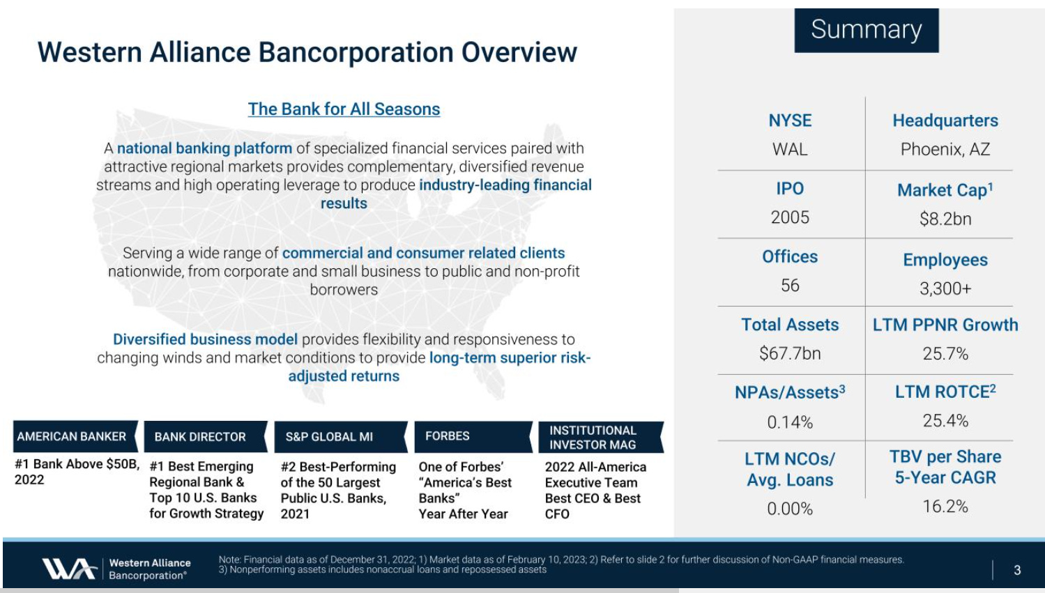Western Alliance is your classic well run bank. It has all sorts of accolades (#1 bank above $50B, one of Forbes’ best banks “year after year”, etc.), return are great (LTM return on tangible equity of >25%, few bad loans, etc.), and I’m sure they’ve got a great culture / everyone who works or banks there is very happy.