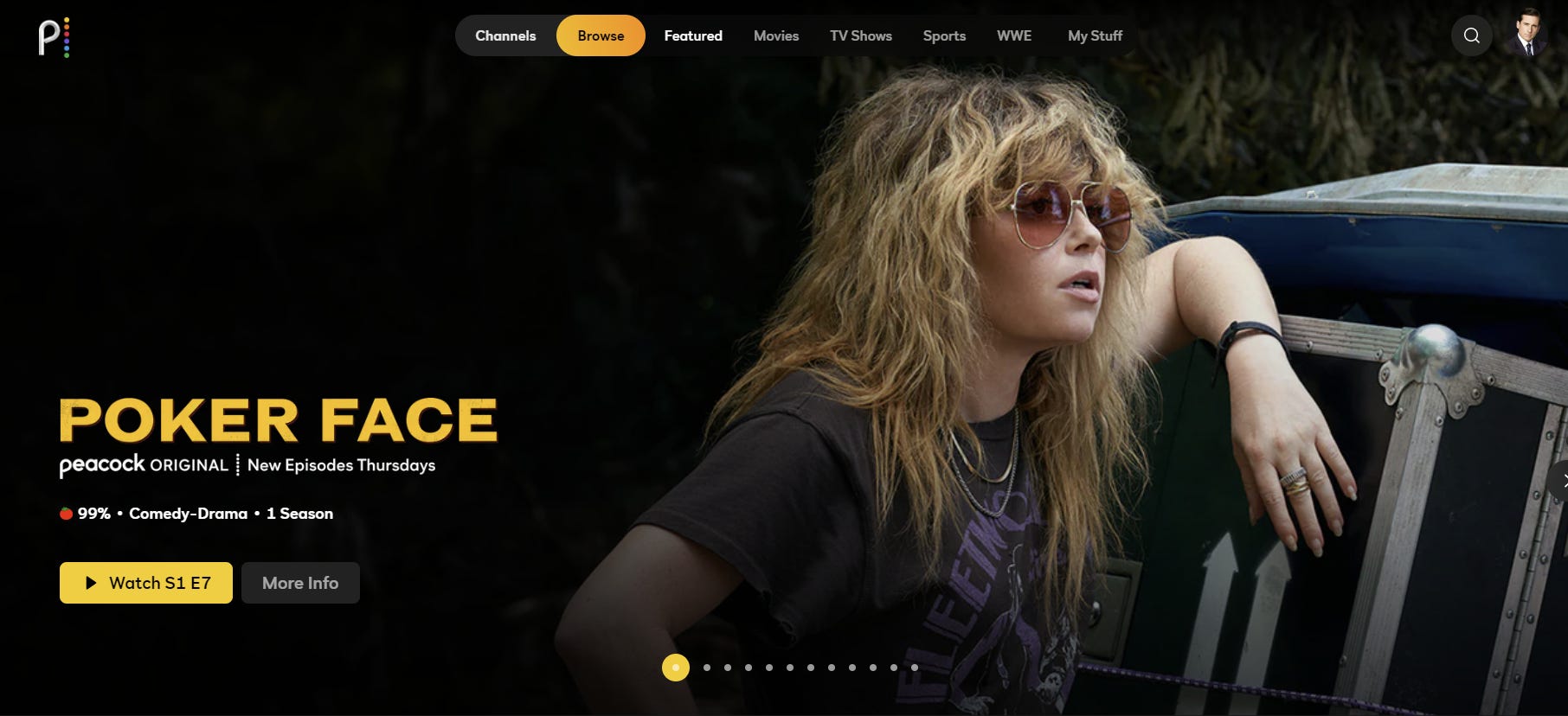 At today’s share price of ~$88/share, the WWE’s EV is ~$6.6B. I see estimates for the WWE to do ~$400m in EBITDA for 2023, so you’re talking about a mid-teens EBITDA multiple. That’s high but not crazy. But ignore the multiple for a second. Below is a screenshot of Peacock I took this afternoon. (BTW- completely unrelated to anything, but Poker Face is delightful).