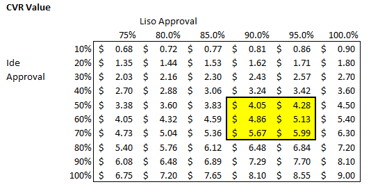 On the podcast, around the 50 minute mark, both Dan and Matt gave liso-cel a ~90% chance of approval by year end. With the inspections happening now, 90% is probably on the low end of approval odds for liso-cel. I've pasted a table below which shows odds of a Liso approval (top row), odds of ide-cel approval (left column), and implied fair value of BMY CVR given those odds. I've also highlighted in yellow where I kind of think fair value is based on the current information we've got.