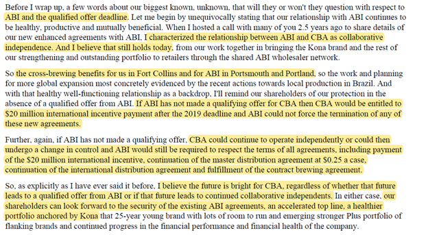So I think the standalone case for BREW has probably slightly improved over the past two years, mainly driven by continued performance of Kona. Slightly offseting the standalone upside, I think the buyout case has probably gotten slightly worse. The case for a buyout happening is still rather simple. There would be decent synergies if AB bought all of BREW; they could cut out a ton of overhead + public company costs (I would guess synergies run $10-15m/year, a not insignificant amount for a ~$300m EV company!), and tighter integration of Kona would probably allow AB to push the brand a bit harder and keep all of the upside from doing so for themselves. And if AB doesn't buyout BREW, then they'll need to pay BREW $20m for their international rights plus run the risk someone else could buy BREW and possibly leveraging their AB contract in ways AB might not 100% be comfortable with. Here's what BREW's CEO said about the possibility of a buyout on BREW's Q4 call.