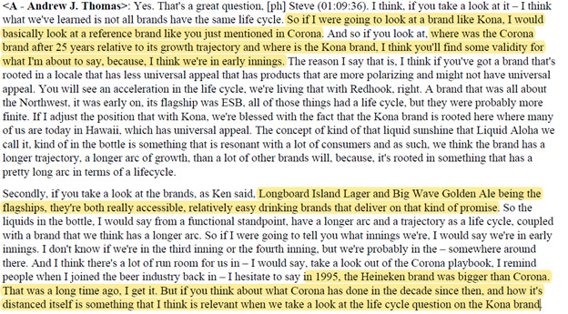 Maybe saying the valuation looks "undemanding" isn't exactly a vote of confidence. But, at its core, an investment in BREW has always been about Kona, and I think if you can buy BREW at an undemanding current valuation while retaining the call option upside from Kona continuing to perform well, than an investment in Kona is interesting. And all signs point to Kona continuing to do well. Depletions and shipments were strong in 2018, and 2019 appears to be off to a good start (they mentioned strong momentum for Kona in Q1 during their Q4'18 call, and their guide implies good momentum as well). The brand should continue to do well domestically, driven by the national ad buys and continued deepening of the AB partnership, and the international opportunity remains relatively untapped (Kona was up 20% internationally in 2018, though off what seems to be a small base)... AB didn't agree to write a $20m check later this year for Kona's international rights out of the goodness of their hears; they did it because they see huge opportunity for Kona worldwide. I've pulled the quote below from BREW's Q4'18 call; I think it's a moonshot for Kona to become the "Hawaiian Corona" but I put it here to emphasize that at an "undemanding" valuation you get any continued growth / operating leverage / moonshot potential for Kona for (effectively) free.