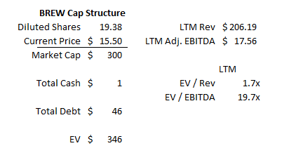 BREW made three acquisitions in Q4'2018. In total, they spent ~$38m on these acquisitions in Q4 (the actual value was likely a bit higher as BREW owned a piece of the one of the brewers and one of the agreements included an incentive payout based on growing shipments; see p. 52). All of those acquisitions closed in Q4, so when you look at BREW's trailing financials you're getting basically zero value for these three acquisitions which, at cost, make up ~10% of BREW's EV.