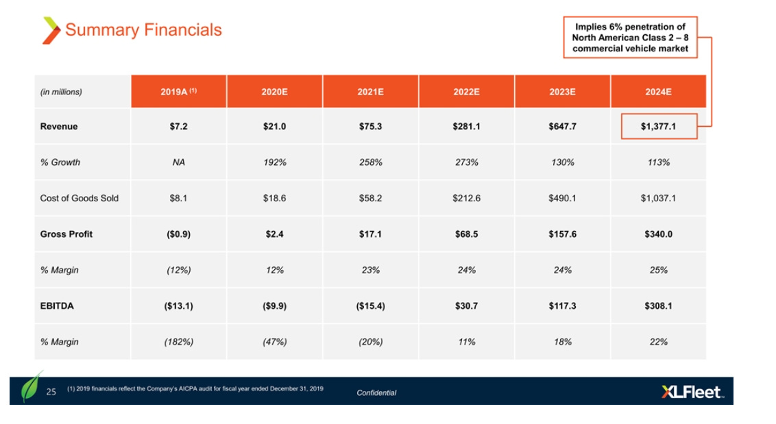 A good example of this opportunity would be XL Fleet (XL; I’ll disclose I have a tiny tracking position just because I’ll buy a tracking position in almost anything trading below net cash). XL is “a leader in vehicle electrification solutions for commercial and municipal fleets”. They announced their deSPAC in September 2020, and boy was it a buzzy one. On top of $232m in cash in trust from the SPAC, they had $150m in PIPE money. The founder went on CNBC to pitch the deal after the announcement, and the stock went parabolic as investors dreamed of a multi-year growth story. Those dreams were in large part supported by the company’s outlook, which projected revenues to grow from basically nothing in 2019 to $280m in 2022 (when they’d hit EBITDA profitability) and almost $1.4B by 2024 (when they’d spit off >$300m in EBITDA).