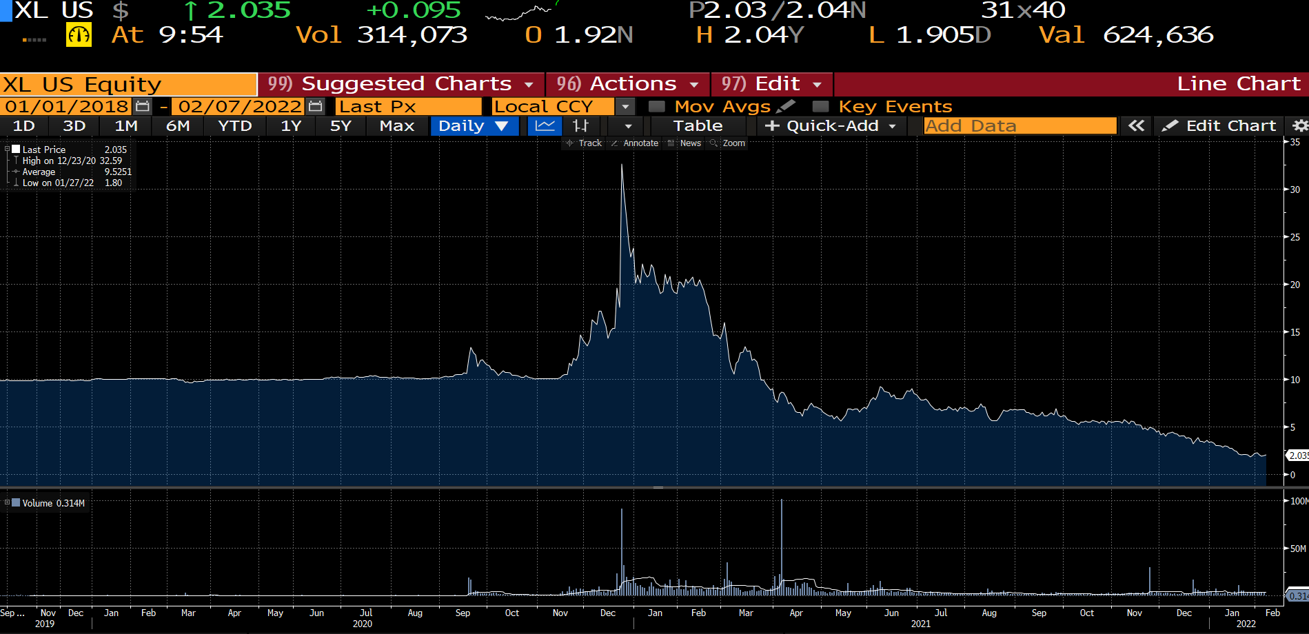 That was really the peak for XL. Since then, the stock has fallen off a cliff. As I write this post, it trades for ~$2/share. Their initial deal projections called for ~$75m in revenue in 2021 and $15m in EBITDA losses; they’re going to miss both those projections just slightly (insert sarcasm emoji of your choice here). Through Q3’21 (they haven’t reported full year results yet), revenue was just $7.6m (down from $9.5m through Q3’20) and EBITDA burn was $35m. XL replaced their CEO in November, and the stock has cratered to ~$2/share.