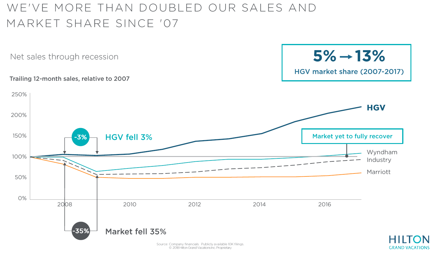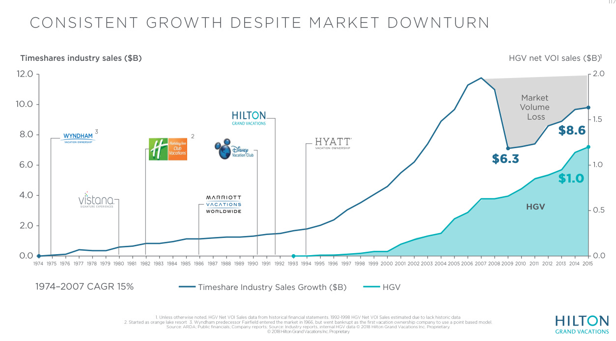 To some extent, a bet on a branded timeshare is a bet on the overarching corporate brand (i.e. a bet on HGV is a bet on Hilton) because so much of their potential growth comes from selling into the corporate brand's rewards program base. I think Hilton is probably the best brand to bet on at this point: it's already one of the largest worldwide, it's growing the fastest, and it doesn't have any of the merger integration risks that could come from the Marriott / SPG merger.