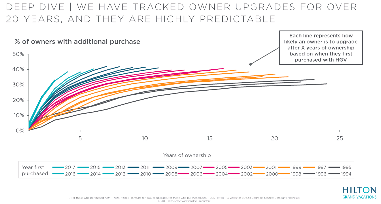 HGV's argument (and similar logic would apply to all timeshare companies, not just HGV) is that ~70% of their earnings comes from the "existing owner" bucket and the "recurring revenue" bucket; each of those are highly predictable / borderline contracted, and that highly predictable nature makes the business much less recession sensitive than you might expect at first. I think there's some logic here. If you read the footnotes, the EBITDA from recurring revenue streams consists of financing and resort management fees. The resort management fees are annual fees charged to timeshare owners; if they don't pay those fees, they'll lose their timeshare. These fees run at ~$1500/year/member (~$500 goes to HGV; the other $1k are annual maintenance fees that HGV equity holders don't get access to- they're required to be put back into the properties to keep them spruced up); given a timeshare package costs ~$20k upfront and gets you access to ~a week of vacation at a luxury-hotel esque property (which would probably cost at least twice as much as the annual fee if you tried to buy on the open market), I doubt owners are going to be defaulting on that annual resort fee unless they are in a really tight spot, so it probably does make sense to treat this stream as contractually locked in. On the financing fees, they are technically locked in but if you're really worried about a recession you're worried about consumers defaulting en masse on these loans. Certainly a worry, though I take some comfort in the credit quality of the book (HGV's average FICO score is 748 as of Q3'18, and the other players are in the same ballpark). Could you see a crazy default wave? Sure, but given the down payment, the high credit scores, and that the annual cost of the timeshare is lower than going on vacation (ignoring the sunk cost of the upfront payment), I think it's unlikely. The EBITDA from existing owner bucket consists mainly of up selling existing owners to larger packages ("ooohhhh, your current package only gets you 3 days in Hawaii every year. Why not spend $5k and upgrade to a package that gets you 5 days in Hawaii every year?"). HGV's argument is they have (literally) decades of data that shows these owner upgrades are highly predictable; in fact, their data shows that the rate of owner upgrade is increasing over time.