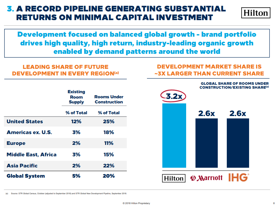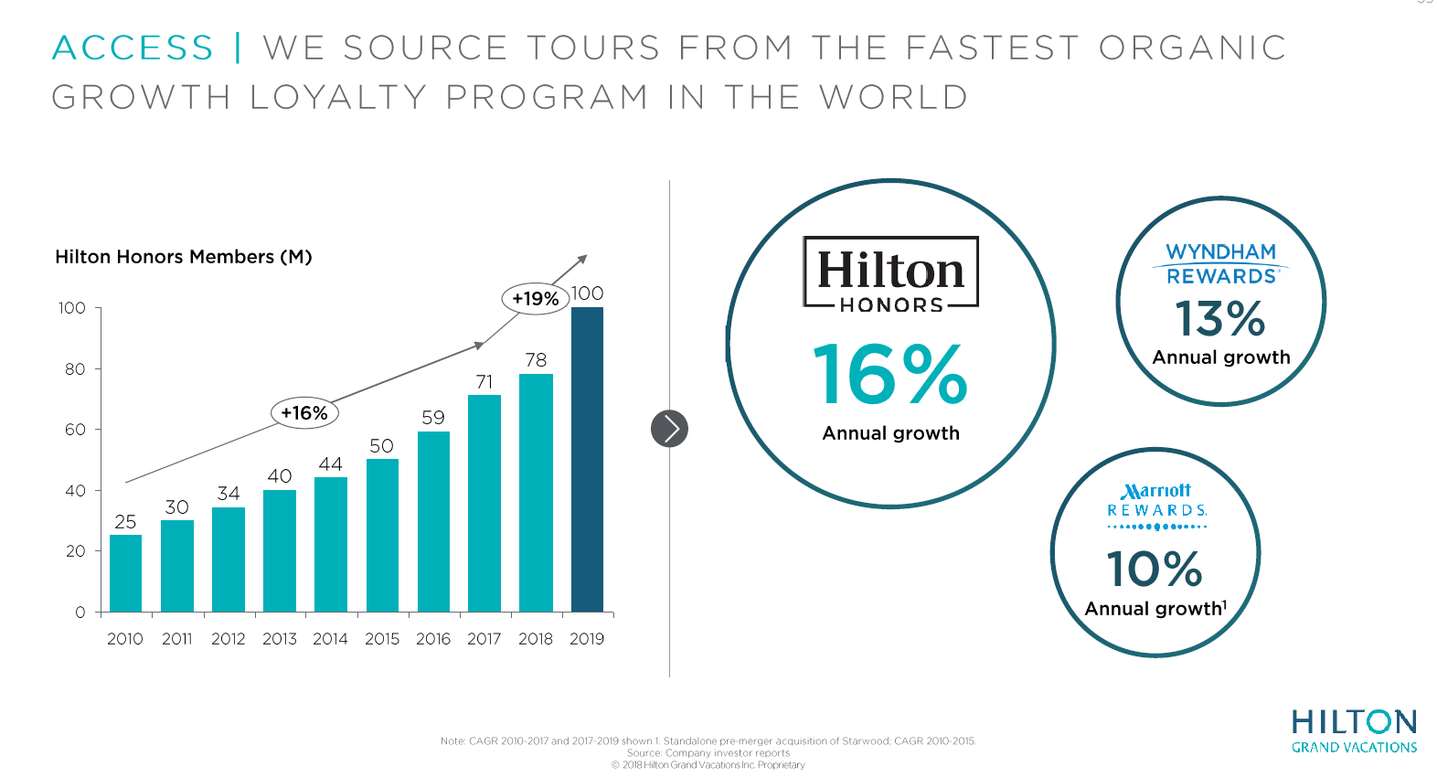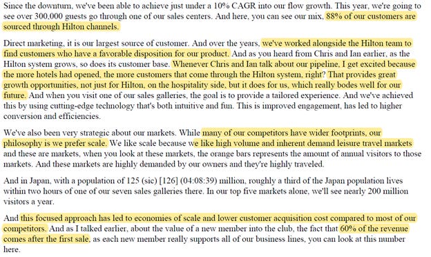 I'm generally bullish on the major hotel chains / brands; I think they continue to take share for a variety of reasons that are probably too long to get into here but include the need for scale to push back against OTA fees and the occupancy / cost benefits that come from having a huge loyalty program. If you believe that the big hotel chains will continue to get bigger, that's incredible for the branded hotel timeshare companies. HGV, for example, will benefit as Hilton grows, as more Hilton loyalty members = more potential customers for HGV to sell to. Here's HGV talking about how their relationship w/ Hilton and Hilton's growth benefits them