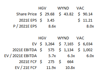 HGV is probably the purest timeshare play. WYND and VAC both have exchange and rental businesses, which are fine businesses that spit off tons of cash, but I think they are growth challenged (as the branded timeshare companies grow, they can operate their own internal exchange networks) and I'd rather just bet on the timeshare piece.