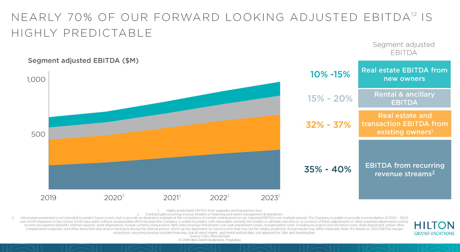 But it's not just new timeshare sales that would suffer in a (hypothetical) recession. Building a new timeshare property is expensive (in effect, you're building a nice hotel), so in a financial crisis a timeshare company could get hit with the double whammy of sales / profits declining while getting stuffed with unsold timeshare inventory / newbuild timeshares that they're investing cash into. So sales are falling while cash is going out the door; never a good combo. And, actually, given many of the timeshares are financed with consumer loans, it wouldn't be "just" a double whammy of falling sales and needing to put out cash for inventory they can't sell; it very well could be a triple whammy where a financial crisis also causes consumer defaults on their loans to rise, so the timeshare companies are sending cash out the door for new-builds while sales are stalling out and consumers are defaulting on their loans en masse, causing huge credit write offs. Put those three together and it's easy to think that every timeshare company will go bust or at least be on life support as soon as a recession strikes. Still, I'm not sure that "timeshares are super cyclical and will be rocked in a recession view" is correct. Let's start by looking at timeshare companies' earnings. The worry is that a recession will see new timeshare sales plunge, so profits will plunge as well. However, a large piece of timeshare companies' earnings actually comes from "highly predictable" earnings these days, so I think earnings would be more resilient than the market seems to be forecasting. The slide below is from HGV's investor day and suggests ~70% of their forward EBITDA estimates are from highly predictable earnings.