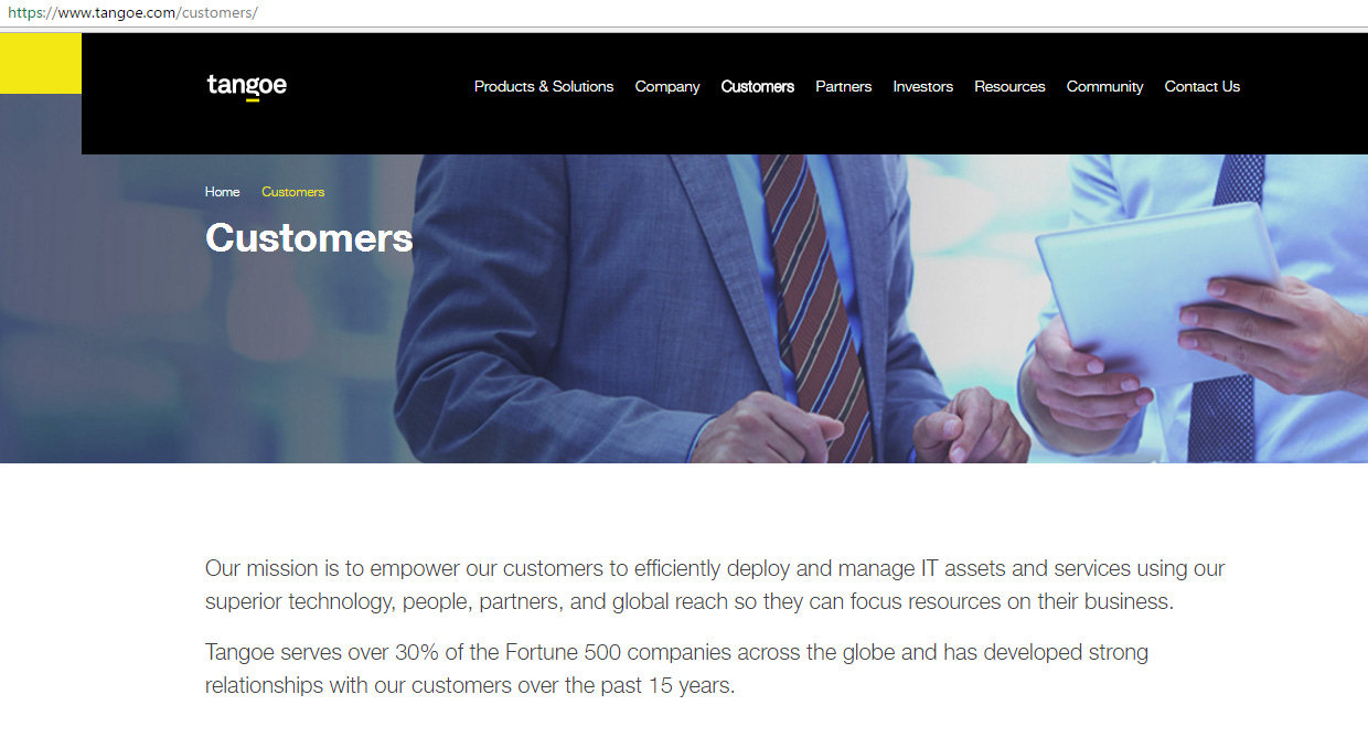 The front page of Tangoe’s website is interesting. It says 49% of the Fortune 500 use Tangoe and that Tangoe manages >$35B of spend (See screenshot below). Why is that so interesting? Because the last time I heard them talk about these numbers was on the heels of Q3’15, when they were managing ~$34B of spend and saying they served over 30% of the Fortune 500 (if you look at the 2nd screenshot below, the customers page still says that). Maybe this is just a data / marketing mismatch, but it’s possible that TNGO has actually grown a bit while they were dark / grabbed a few new customers and the new financials / outlook is going to look at lot more positive than we expect.