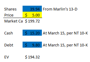 I’ve been using ~$200m as they company’s EV. You can see how I get there in the cap table below. Actually EV is probably a tad higher; I’m simply using the shares outstanding number from Marlin’s acquisition offer but not including the 2.7m in the money options or 1.7m RSUs. Obviously those bump the EV up a tad (~$20m assuming full dilution with no cash coming in from the options), but honestly I don’t think it changes the math here one way or the other.
