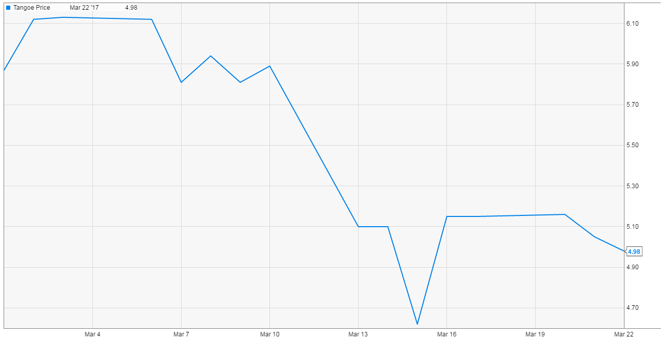First, the exchange kick has likely created a bunch of uneconomic selling. Some funds simply can’t own non-exchange traded stocks, and in addition to getting kicked off the exchanges, Tangoe was kicked out of several indices (see here and here). We can see good signs of that uneconomic selling in Tangoe’s price and volume since the kick was announced. Tangoe has traditionally traded 75-100k shares per day; in the 4 days post kick (starting march 13th), Tangoe traded 3.3m, 2m, 8m, and 2.3m shares. Over that time frame, the stock sank from ~$5.80 in the days before the kick to today’s prices below $5.