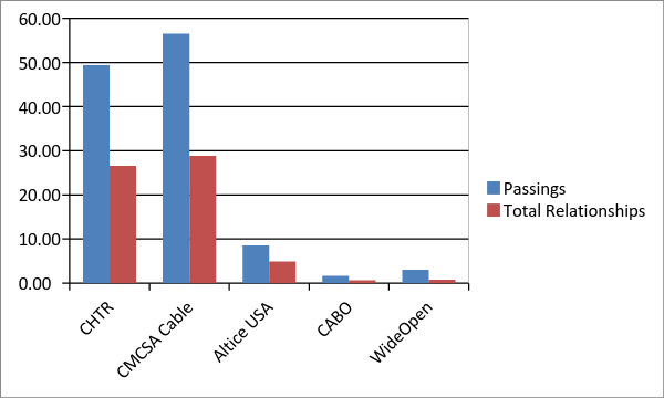 A quick overview on the upside thesis for Charter: after the merger with Time Warner Cable, Charter is the second largest cable company in the U.S. (Cox belongs in the chart below as well, but they're private so I didn't include them).