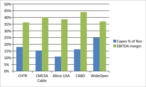 Cable should be a bit of a game of scale: as you get larger, you can get better pricing on your video contracts, spread your back office fixed costs over a larger base, and squeeze your suppliers a bit on pricing. Despite being the second largest player, Charter’s EBTIDA margins and capex levels are more in line with regional players (this is a bit of an oversimplification given a lot of smaller players are dropping lower margin video products, but it gets the point across).