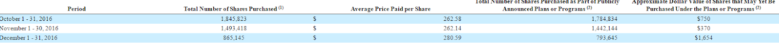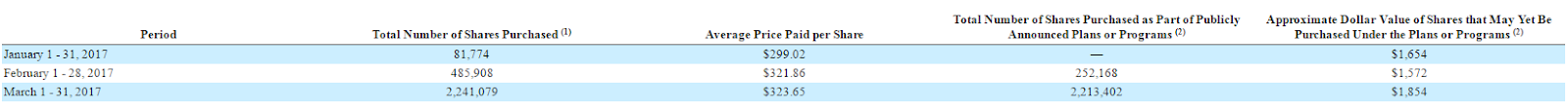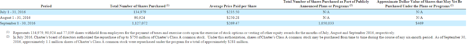 Below are Charter’s last 3 share repurchase disclosures (from their 10-Qs and 10-ks). Look at that March 2017 share repurchase number: 2.2m shares. Charter had 309m fully diluted shares out at March 31, so if Charter held that 2.2m number steady for a full year they would retire ~8.5% of their shares in a year. That’s an insane amount of share buybacks.