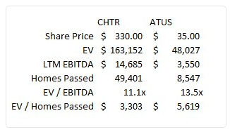 The bull thesis is that, over time, Charter should be able to approach Comcast like levels, which should drive continued strong earnings growth over the next few years. Despite that built in earnings growth, Charter trades pretty much in line with peers; for example, here’s a valuation chart comparing them to peer / recent IPO Altice that I tweeted out a few days ago.