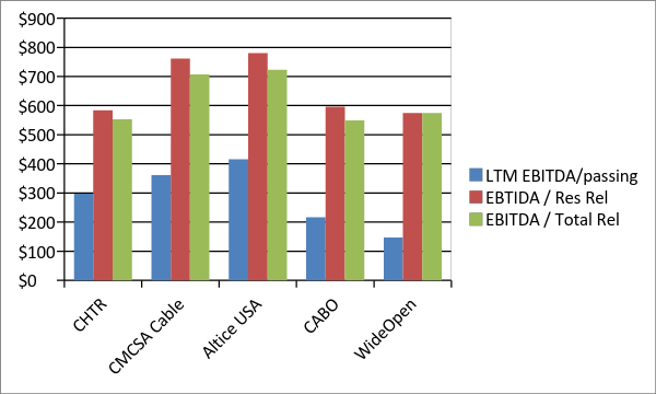 Digging deeper than simple margins, cable is often judged on its profit per home passed or profit per relationship. Charter lags behind peers on these metrics as well.