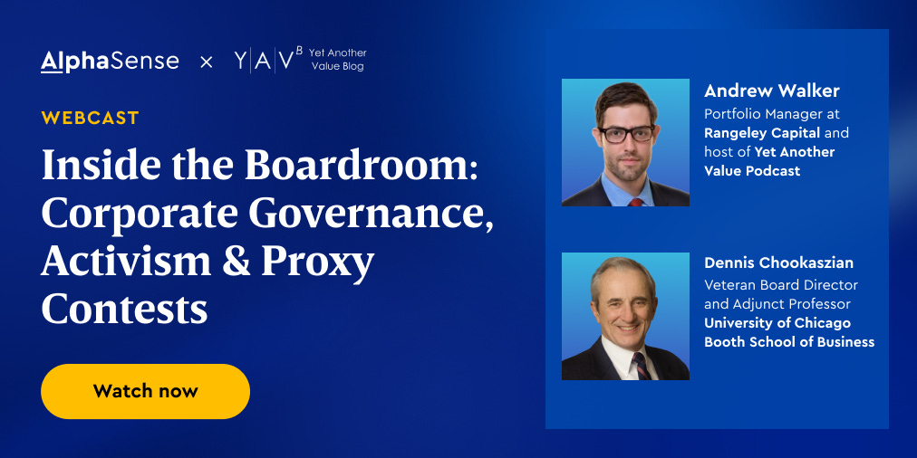 Most of my recent focus has been on companies trading with a corporate governance discount (particularly the biotechs). Given that focus, AlphaSense was kind enough to offer to sponsor a webinar with a corporate governance expert who could provide real world insights into corporate governance and boardrooms from his decades of experience. The webinar is live now, and you can check it out here.