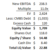 So let’s put it all together: if we slap an 11x multiple on $239m of EBITDA and take out $1,035m of CMBS debt but addback $120m of excess cash, we come out with an equity value of ~$1.7B and a per share value for CorePoint of ~$14.48/share. Add that to the $8.40/share in cash from the Wyndham deal and shares should be trading for ~$22.90, presenting ~23% upside to today’s share price of ~$18.60 (or ~42% looking through the $8.40/share cash payment).