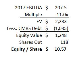 On a PF basis (with a fully loaded standalone cost structure and adjusted for the new external management contract), CorePoint earned ~$207m in Adj. EBITDA in 2017. While CorePoint will be unique in its focus (it’ll focus on midscale and upper-midscale select service hotels; most peers are higher end and tend to be full service focused), both peer multiples (CLDT, HT, INN, and RLJ are the best peers) and individual La Quinta hotel transactions suggest CorePoint should be worth at least 11x EBITDA. With 118m shares out and the company taking out a $1,035m CMBS loan as part of the transaction, we can come up with a loose valuation.