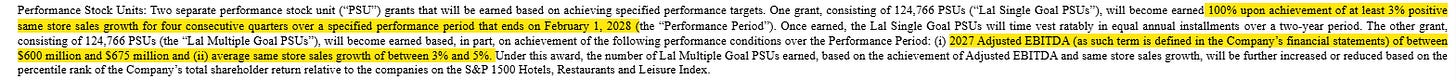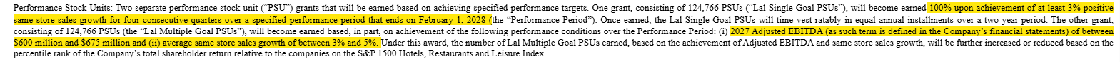 One more example of PSU grants that could cause problems: PLAY gave their new CEO PSUs that vest based on SSS growth and adjusted EBITDA targets. You could think of a worse way to incentivize a CEO, but this one is pretty bad. Why? It’s near impossible for a restaurant to report negative adjusted EBITDA, so you just handed the CEO a comp package that said “go open a ton of units no matter the return on investment and you will get paid. And, if you do it quickly, those units enter the comp base while still in the honeymoon period, thus helping you hit your SSS target!” Combine them, and the CEO is incentivized to rush to open a ton of units. Yikes.