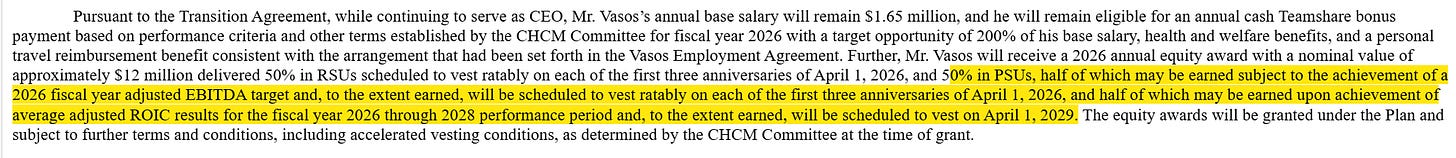 Some background: in March, DG appointed a new CEO who would take the helm in January 2027. They gave their current CEO a transition agreement to encourage him to stick with the company through the end of the year. It includes a PSU package that vests 50% based on 2026’s EBITDA and 50% based on ROIC from 2026-2028.