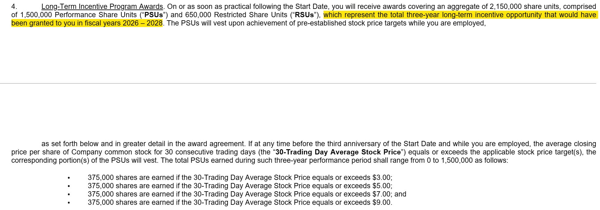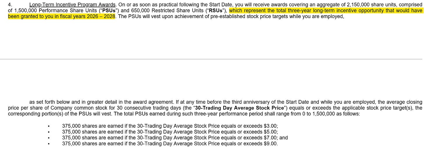 Again, an example will highlight this nicely. Consider HAIN; in December, they promoted their interim CEO to full time. As part of that promotion, they gave her a big PSU grant upfront and explicitly stated that the big grant represented three years’ worth of grants (i.e. she would not get any grants in FY27 or FY28). HAIN’s stock was trading for just over $1/share, and the grants required the stock to get to $3-9/share within three years. At the high end, this package was worth ~$13.5m in PSUs if the stock could 5-10x inside of three years.