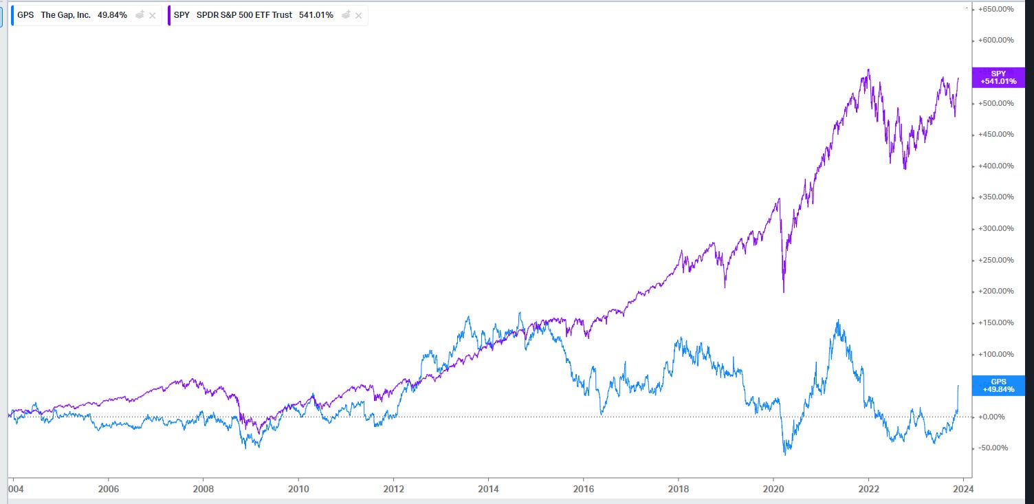 The second most popular recommendation as an inevitable winner was CROX (which I have a great podcast with Mitchell Scott here) on the thesis they’ve proven to have international legs and the market has way underestimated the likelihood of continued growth for something that’s proven to be this popular internationally. (Note: on top of asking for companies that could be hitting the winning “inflection”, my post also asked readers examples of different potential inflection points that could identify a winner, and a very popular one was when a company successfully expands into an international market. I think international expansion is a sign of a successful company, but I absolutely do not think it makes for an inevitable winner. HD has been an enormously successful company, and they’ve achieved that success with largely domestic dominance (international sales make up <10% of their sales). On the other hand, there are plenty of apparel retailers (like GPS) that have crated very successful international businesses but whose stocks have materially underperformed; the SPY is up >10x on GPS over the past 20 years!).