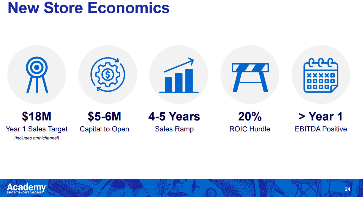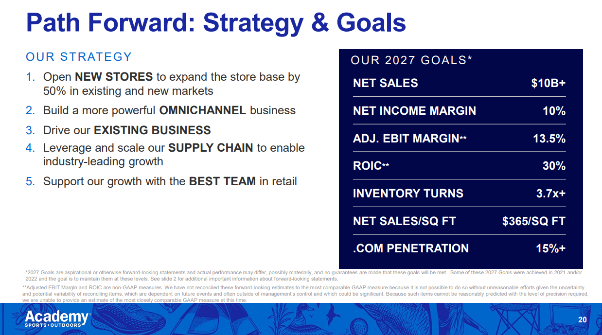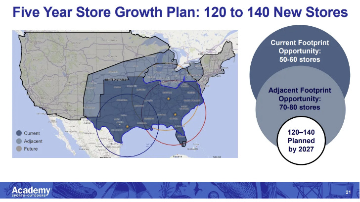 To open new stores to expand the store base by 50% in existing and new markets. Nothing says leadership or winning in retail more than taking the cash you're generating, investing it back into yourself and multiplying it. And that's what we're going to do. We've grown 30% since 2019 through operational improvements, and through academy.com. We've grown 30% with no new units, imagine what's possible when we start adding units. And so our plan is to open 120 to 140 new stores between now and 2027. And so one more time, that's 120 to 140 new stores between now and 2027