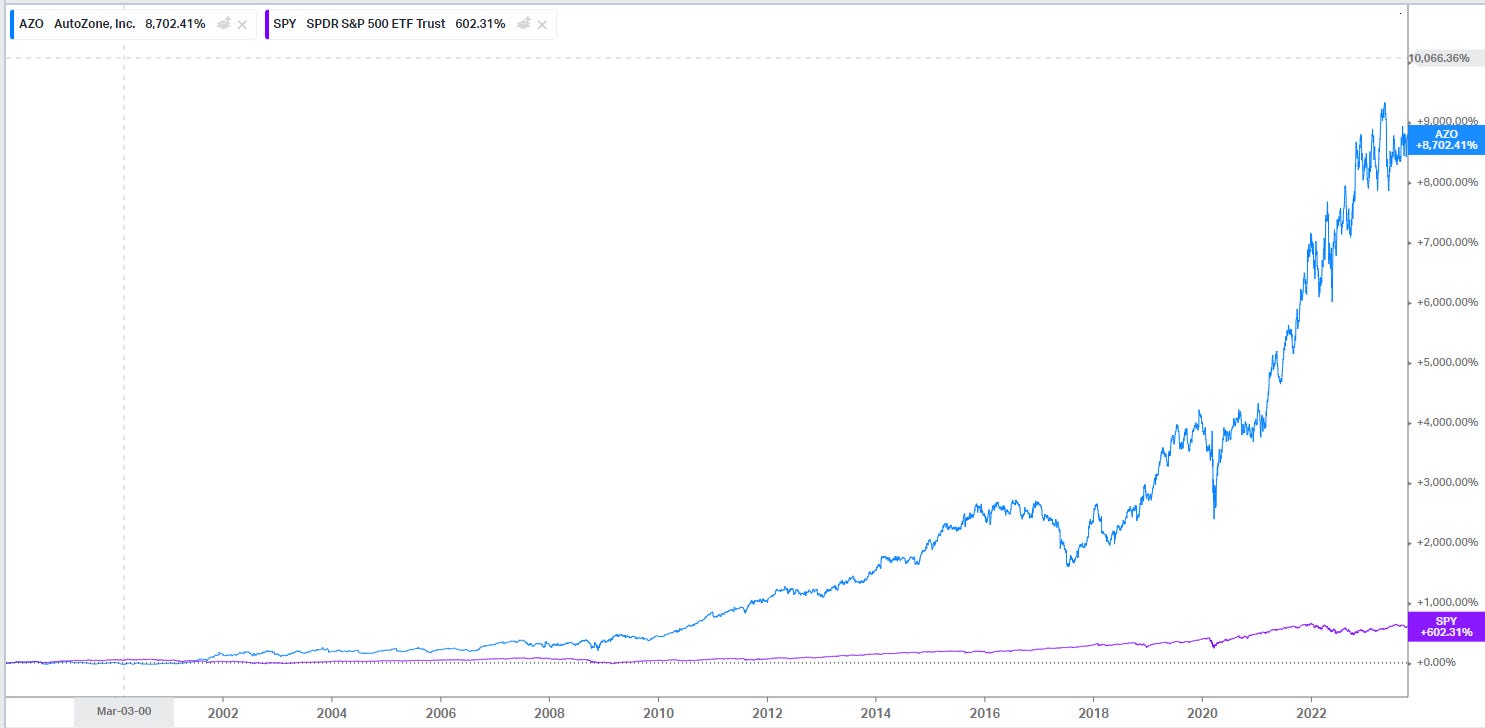 AZO had ~3k domestic stores open in 2002 (plus 39 in Mexico!). They had 6.3k domestic stores in 2023 (plus another 740 in Mexico and 100 in Brazil). So, over 20 years, they more than doubled their domestic store base. That’s not shocking growth….. but it’s certainly nice!