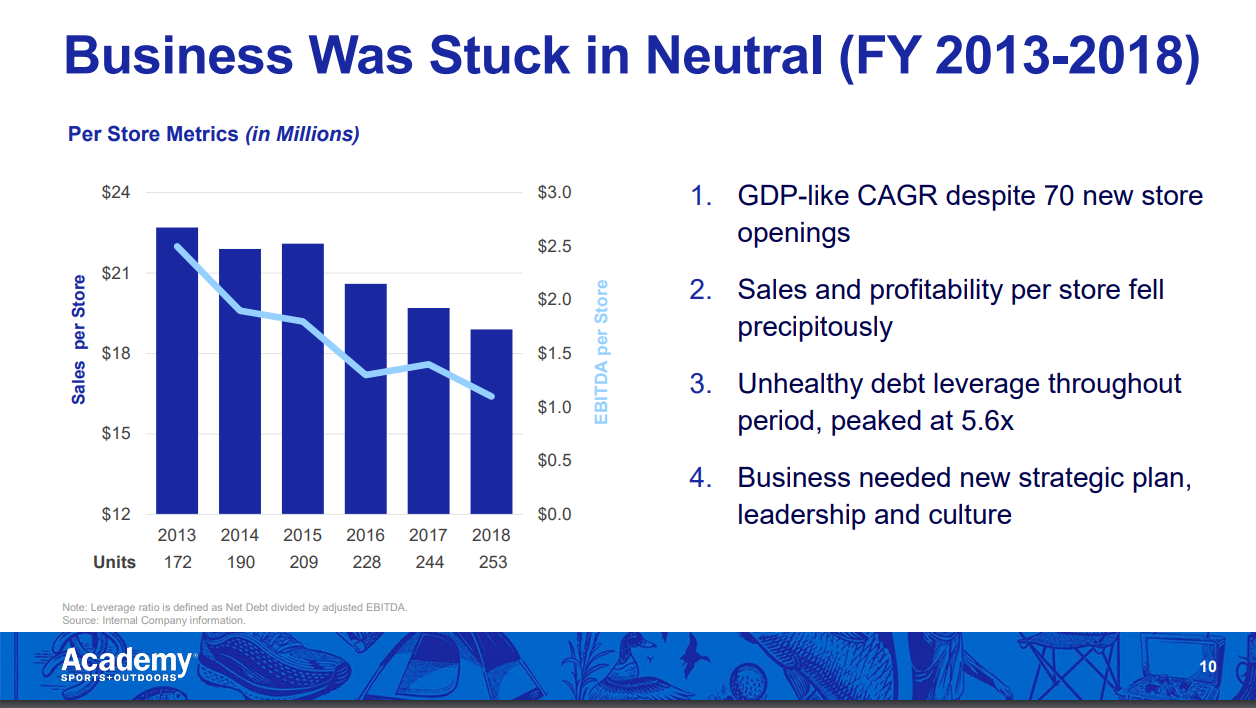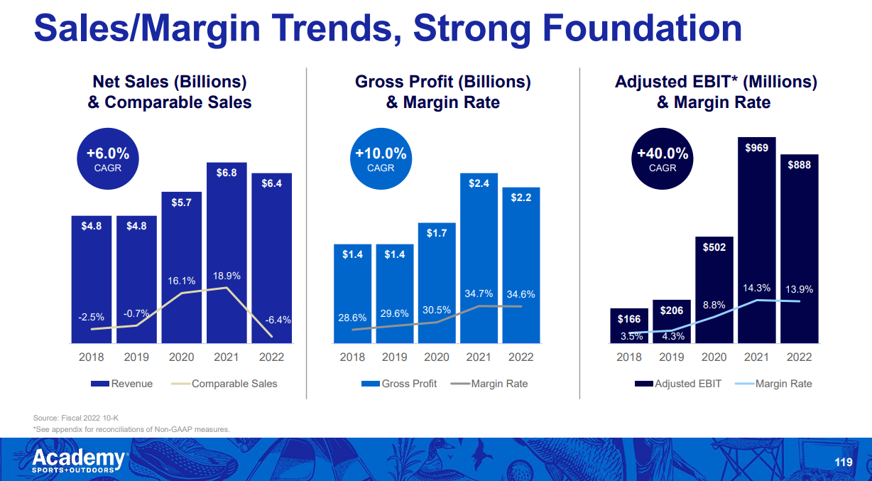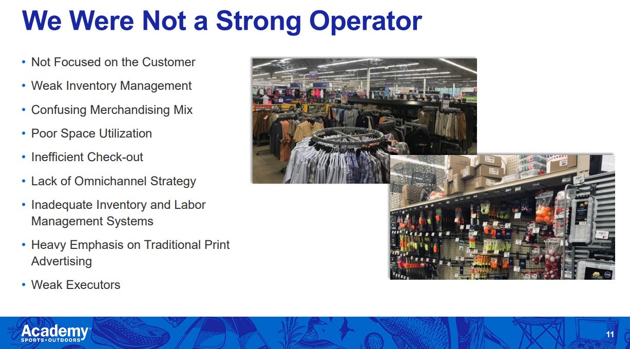 I think ASO would pushback hard on that line of thinking; new management took over in 2018, and they would argue the business was “stuck” (read: mismanaged) before they came in. They’d argue the COVID returns simply added fuel to the turnaround that was already under way at Academy, and margins has already started to expand.