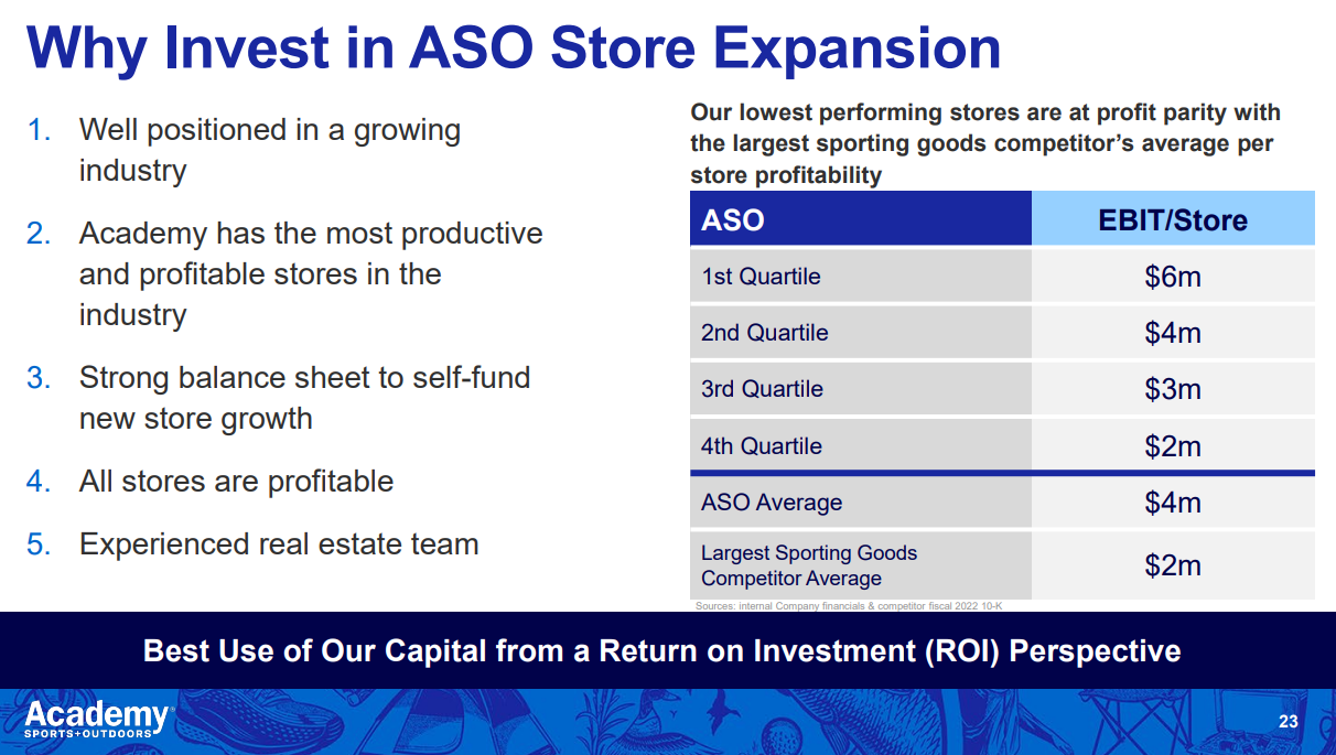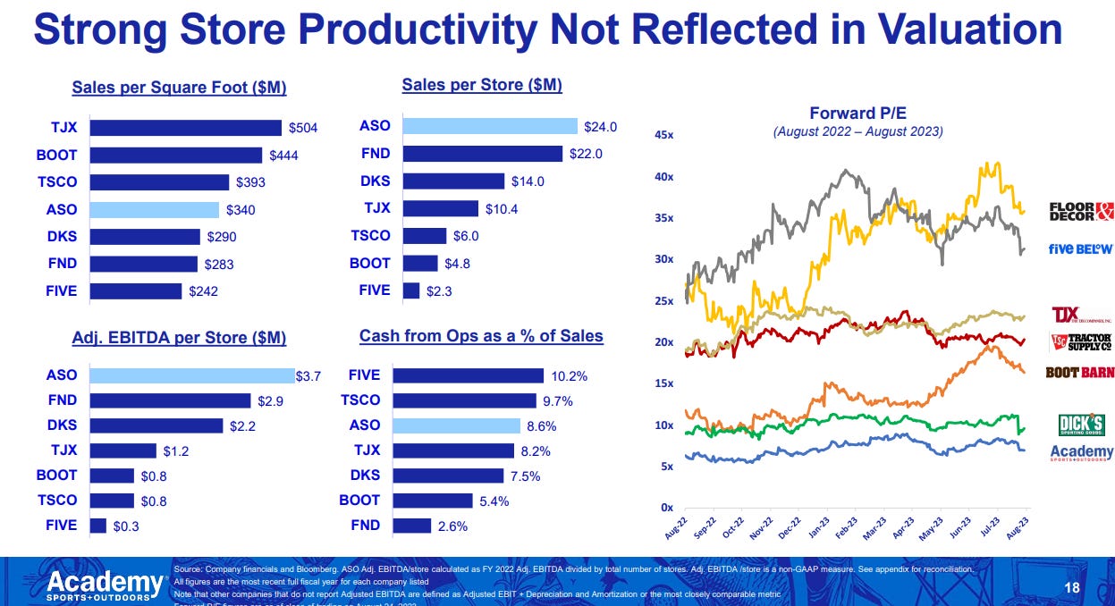 I don’t think it’s explicitly necessary to have super happy employees to deliver incredible retail returns, but there does seem to be some correlation between having really happy employees and being a long term retail compounder. Tractor Supply has mentioned hiring their most passionate customers as employees, everyone raves about the Chick-Fil-A culture, etc. Walmart today gets a bad employer rap, but in the very early days the employees were really dedicated and happy to work there (at least that’s my memory from the Sam Walton book, which admittedly could have some bias), Anyway, I mention all those examples because ASO likes to pitch that they’ve got a little of that magic going on in their stores / with their employees, and honestly, I could believe it. Where would you rather work: selling a kid his first baseball bat at Academy, or at a generic retail job selling clothes?